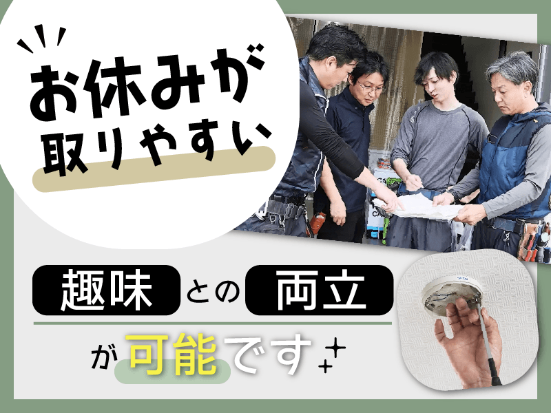 求めている人材 【必須】要普通免許(AT限定可) ――――――――――――― *「工具を触ったことがない」 レベルでもOK *20代・30代中心に、50代まで活躍中 *正社員デビューOK ――――――――――――― \\ こんな方にもぜひ //  ̄ ̄ ̄ ̄ ̄ ̄ ̄V ̄ ̄ ̄ ̄ ̄ ̄ ̄ ●第二種電気工事士、第一種電気工事士、 電気通信工事、ビル設備管理、 電気工事 アルバイト、配線工事 などの経験を活かしたい方 ●未経験から資格取得を目指したい方 ・・━━・・━━・・━━・・━━・・━━・・━━・・ ┏━━━━━━━━━━━━━━━━┓ ⧉未経験スタートでも成長できる環境⧉ ┗━━━━━━━━━━━━━━━━┛ ✅当社では未経験スタートの方が大半。 そのため、教育制度が充実! 先輩が横について 基礎から教えてくれます! 分からないことなどは都度質問OK! できることが増えた分だけ しっかり評価します◎ その頑張りは、もちろんお給料に反映! モチベーション高く働ける環境です。 「技術力アップ」や 「努力する」以外にも、 資格取得や時間外勤務などのがんばりも 評価しています! ・・━━・・━━・・━━・・━━・・━━・・━━・・ ✅現場では自然と声を掛け合う雰囲気 があります。 →困ったときはすぐフォローできる体制 ✅仕事終わりや休日は各自自由に 過ごしています。 →無理な付き合いは一切ありません◎ 円滑に業務が行えることと、 高い成果を生み出していることが 何よりの証拠に◎ 社員旅行や夏にはBBQを開催するなど、 イベントは年に数回ありますが、 参加は自由です! 家族や趣味の予定を優先してOK◎