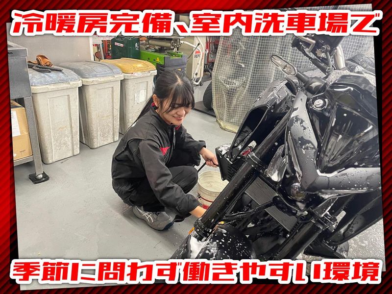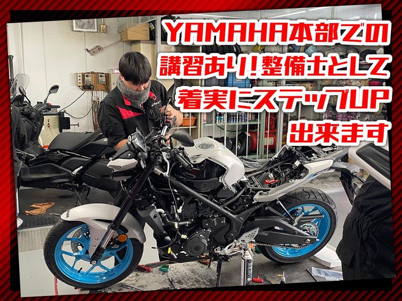 仕事内容 YAMAHA専門店で整備士へ! ✨本部講習で本格的な技術を習得 ✨勤務中も先輩がサポート ✨会社の支援で資格取得OK せっかく手に職つけるなら、 好きなバイクにしませんか? 技術を学んでいけば、 仕事でもオフでも 車両のカスタマイズができるように。 意欲があればお客様が参加する ツーリングイベントの企画にも挑戦OK! みんなで好きな場所に出かけましょう♪ 仕事を通してバイクの楽しさが広がります! - 【こんなお仕事をお任せします】 ●バイクの整備・修理 ●車両オプションパーツ取付・カスタム ●車検対応 ●ガラスコーティング ●お客様対応 ●販促・イベント企画 など 整備を中心に、 バイクショップでの業務全般をお任せします。 まずは先輩のお手伝いからスタート! 未経験の方は簡単な作業から任せるので、 道具の名前や使い方、バイクの構造など、 ひとつずつ知識を増やしていってください。 先輩がマンツーマンで業務習得をサポートします。 既にバイクの整備経験がある方も、 当店のシステムに慣れるまでは 補助的な業務をお願いします。 \YAMAHA本部での講習あり/ 基礎から学べるカリキュラムで、 整備士として着実にステップUP可能! 未経験だった社員が 「ヤマハ世界整備士コンテスト」で 全国2位になったこともあります。 - 【まだまだ魅力をご紹介!】 \整備場も冷暖房完備/ 洗車も屋内で出来るのは、 業界内ではかなりレア。 寒い冬や暑い夏も快適です♪ \しっかり休めてオフも充実/ ⇒2025年度は「夏季休暇9連休」に、 「年末年始14連休」でした! 残業もほとんどないので、 自分や家族との時間もしっかり確保。 メリハリをつけて働けます! \嬉しいインセンティブあり/ ⇒販売台数や整備の目標を達成すれば、 インセンティブが支給されます。 頑張ることで給与がUPするので、 モチベーションに繋がります♪