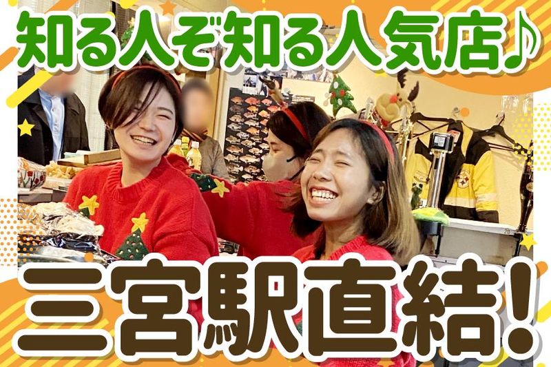 仕事内容 <給与手渡し♪フリーター歓迎!> <週1日~OK!1日3h~OK!> <売上達成に応じて昇給有!> 三宮駅直結!知る人ぞ知る人気店* 手作りの絶品まかない有! 忙しい日も皆さんのまかないご飯を 気持ちを込めて作るように心がけています。 卒業までや就職しても働く スタッフもいるくらい定着率バツグン! 今回、大学1回生から働いてくれてた方々が 就職卒業で3年に1度のスタッフ大量募集となります! 【お仕事内容】 カウンター越しに接客やドリンク作りを お任せします! 慣れてきたら、調理補助もお任せしていきます◎ 簡単な事から始めるので 未経験の方でも安心して勤務できます! →日本酒や旬の魚料理を中心に、 立ち飲み屋とは思えない こだわり抜いた酒と肴、 お客様の層も良く、安心して働けます。 →お客様で会社の役員の方などと 話す機会もあるので、 マナーもしっかり学べることができ、 就活などにも役立っています。 基本的に決まった仕事を真面目に取り組んでいただけたら あとは楽しく気楽に働いてくださったら大丈夫です◎ 【お店について】 さにぃは楽しい働きやすさが自慢の お店ですが、実は料理も自慢! マスターが淡路や玄界灘などで 釣りたて魚を目の前で捌いたり、 高級寿司店でしか出ないような肴が 格安で食べれます。 お酒も酒屋さんからの選りすぐりを 仕入れており 楽しい雰囲気・絶品料理・立地の良さが 揃った店舗! 雑誌等で取り上げられることも多く、 働いていることが自慢できるお店* 賄い、おもろい仲間、優しい常連さん 全部揃った最高バイトで稼ごう! スタッフのプライベートも大切に、 みんなで相談しながらシフトも決めているので、 早入り早上がり、遅入りラスト、通し希望など 融通が効くようにしています。 【スタッフについて】 20~50代まで幅広い年齢層のスタッフが活躍中! 居心地が良く、就職後も働いている スタッフもいるぐらい 定着率がバツグンです! ですので、大学を卒業後、 就職してからの副業としても 大々的に応援します!