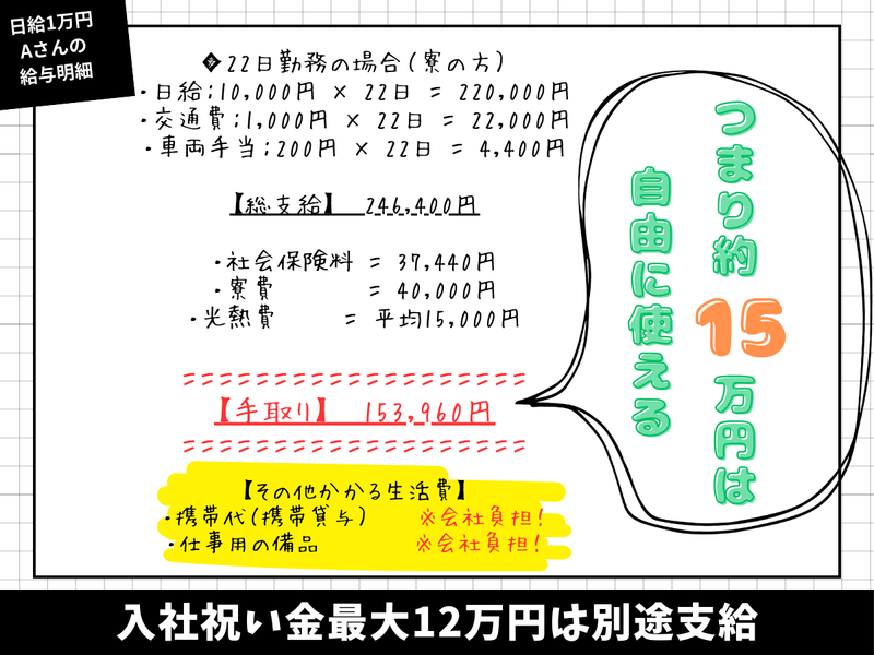 職場環境 給与は普通でも、生活コストがほぼかからない働き方なので「思ったより手取りが残る」と言うスタッフが多いです。 その理由は、会社負担の細かいサポートがとても多いから。 気づけばみんな長く働いてくれているのが自慢。派手さはないけど、あたたかい職場で働きませんか? 喫煙所:喫煙所あり(屋外)