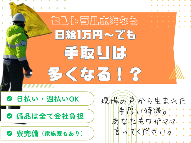 仕事内容 【ご応募・お問い合わせは電話でもOK!】 TEL: 0532-39-8020 担当:採用担当まで 平日・土日問わず受付可能! 「求人を見て電話しました。」 とお伝えください! ⭐めっちゃ充実した待遇アリ⭐ ✅入社祝い金12万円支給!(規定あり) ✅寒い冬も汗が出るほど あたたかい<電熱ベスト>支給! ✅必要備品は全て弊社負担 ✅日払いOK、週払いOK(規定あり) =================== <具体的な仕事内容> ■工事現場や建築現場の交通誘導員 豊橋や豊川、蒲郡を中心とした 東三河エリアでのお仕事です。 最初は交通量の少ない現場からスタート! 慣れるまではしっかりサポートするので 未経験の方も安心してくださいね。 =================== ✨年齢・性別・学歴・職歴すべて不問✨ 学生・シニア・フリーター・主婦など 男女も問わずいろんな方が活躍中! ✨全員面接(警備業法により18歳以上)✨ 「待遇について聞いてみたい」 「自分にもできるかな」 「転職・就職したいけど、迷っている」 なんでも気張らずにお気軽にご相談ください。 【インスタグラムで 「セントラル東海」の情報を更新中!】 https://www.instagram.com/centraltk_2023/ @CENTRALTK_2023