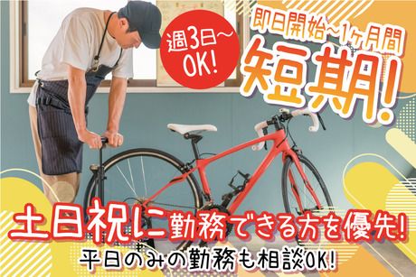 仕事内容 ■子供用からスポーツ用まで種類様々♪サイクルショップでの接客販売 自転車販売店でのお仕事です♪ 接客経験や自転車に関する知識がなくても大丈夫◎ 勤務開始前に研修があるため、 お仕事に関することはイチから学べます! 安心してお仕事を始められますよ! <お仕事内容> ・お客様お出迎えの挨拶 ・購入希望のお客様へのニーズヒアリング ・商品のご提案(社員さんに引き継いでもOK) ・車体お渡し時のご説明 ・梱包解き、お客様に渡す書類の準備、自転車の陳列、空気入れ ・その他店舗運営に伴う付帯作業 ※レジ業務なし ■未経験OKの短期!20代~50代の男女スタッフが活躍中! 「次の仕事までの繋ぎに」 「短期でサクッとお小遣い稼ぎ」 「お仕事復帰としてまずは短期で働きたい」 「自転車が好き」 「人と話すのが好き」etc… どんな動機でも大歓迎♪ 研修を受けてから勤務スタートなので、 接客・販売が初めてという方もご安心ください◎ 高時給だから短期でも効率よく稼げます! ■柔軟シフト!週3日~OK◎短時間でもフルタイムでも歓迎! あなたの希望に合わせて勤務時間を決定! まずはご相談ください♪ 「土日祝メインで働きたい」 「家事の合間に時短で働きたい」 「週3日でWワークとして働きたい」 「長期休みの間だけ働きたい」 など、様々なライフスタイルに対応いたします! もちろん、がっつりフルタイム勤務も大歓迎◎ ■来社&履歴書不要!電話でお仕事のご紹介が可能です。 今回募集しているお仕事に関して もっと詳しく説明してほしいと思われた方には、お電話でしっかり説明します。 来社&履歴書不要でお仕事のご案内が可能なので 仕事が休みの日や仕事終わりなど、 あなたの都合のよいタイミングで連絡いただければ希望のお仕事を案内しますので まずはご応募ください。