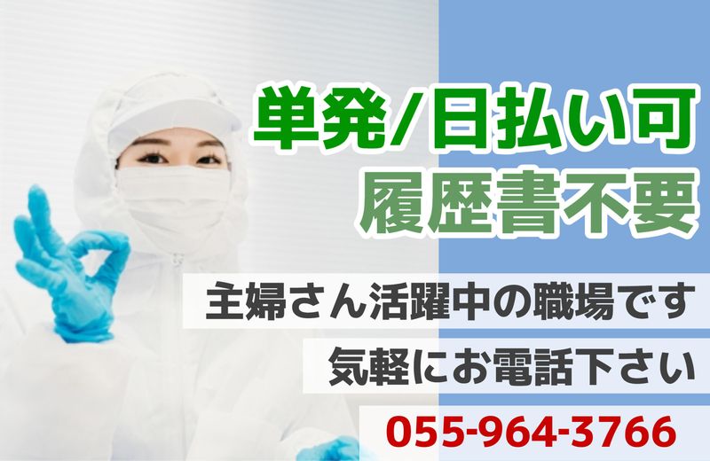 仕事内容 短期でサクッとおしごと♬ 単発バイトの登場です(^▽^)♪ 1日~勤務可能のお仕事✨ 履歴書も不要なので、思い立ったら すぐお仕事スタートできちゃいます!! =================== ⭐ ご応募お待ちしております ⭐ 電話1本で応募完了【055-964-3766】 WEBからは24時間応募受付中です✨ 面接は簡単な内容ですので 緊張せずお気軽にご参加ください♪ =================== ━━━━━━━━━━━━━━━━━━━━ 【お仕事の内容】 化粧品の梱包作業等を行っていただきます。 パワーは不要!の軽作業ですが、 ライン作業になので黙々と手を動かすことが 得意な方にピッタリです☆ 一緒に作業に入るほとんどのスタッフが 未経験なので、心配は不要です♪ お知り合いと一緒にご応募も大歓迎です! ※勤務日や日数は希望制ですが、 定員に達した際はご案内できない 場合がございます。 ━━━━━━━━━━━━━━━━━━━━ [ここがポイント] ⭐土日祝休み 1か月の中でできる日だけでOK! 1日~単発も可! お仕事してみて、これなら出来そう! と思ったら日数を増やすことも可能◎ ※その後の期間も再度募集をかける 場合がございます ⭐日払い制度あり サッと稼いで、スグ給料日♪ 翌営業日に全額支給します※規定有 ⭐沼津市~現地までの送迎可能 沼津市添地町にある東和テック本社から 御殿場市保土沢にある就業場所まで 送迎が可能です! 帰りは途中下車も可能ですので ご相談ください◎ ━━━━━━━━━━━━━━━━━━━━ 「お金が必要な時だけサクッと稼ぎたい」 「融通がきくお仕事がしたい」 そんなあなたにピッタリの働き方が可能☺ 「こんな働き方はできる?」といった 質問だけでも大歓迎です♡ まずはお気軽にご連絡ください‼ ━━━━━━━━━━━━━━━━━━━━
