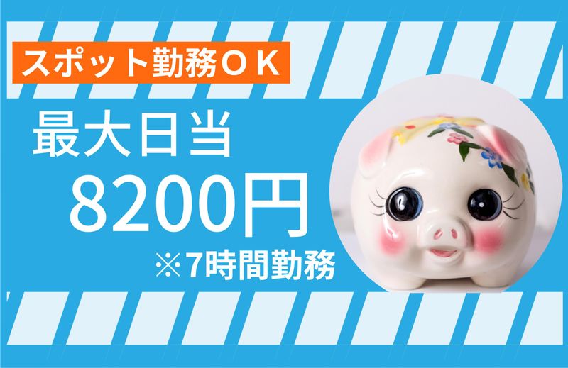 時給1,100円 給与詳細 基本給:時給 1100円 【手当】500円/日あり ※自力通勤の場合のみ 【給与例】 給与例 時給1100円×7時間 =7700円+手当500円 =日当8200円