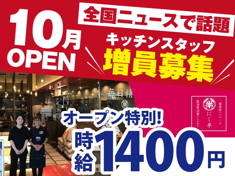 仕事内容 ・・・・・・・・・・・・・・・・・・・・ 10月にOPENしたばかり! 予想以上の大反響の為、増員募集!! ・・・・・・・・・・・・・・・・・・・・ \全国ニュースで話題になりました!/ 国内最高級魚沼産こしひかり食べ放題という 独自の取り組みで、全国放送のテレビに 取り上げられた実績を持つ「にく半」。 新店舗となるイオンモール成田店も、 その話題性と人気を引き継ぐ形で 10月にOPEN! 予想以上の大反響の為、増員募集します! ✅未経験歓迎!アルバイトデビューも☆ ✅週2日・1日3h~OK! ✅美味しいまかないつき✨ ✅今年中だけ時給1400円! ◆ 仕事内容 絶品”板前ハンバーグ”の キッチンスタッフを募集いたします! <具体的には…> ・簡単な調理補助 ・洗い場 など \ 初バイトでも安心! / 難しいことはナシ◎ 飲食が初めてでも問題なし☆ にく半はマニュアル完備なので、 安心して始められます! \ 高時給スタートで稼げる! / なんとオープン特別時給として、 今だけ時給1400円!※年末年始連休まで その後も高時給1200円で、 継続して安定収入をGETできます☆ \ 週2日・1日3h〜OK! / シフトは柔軟に調整できるので、 学校・家庭・プライベートとの 両立がしやすいです。 「授業終わりに夕方から」も、 「家事や育児のスキマ時間に」 も大歓迎! テスト期間や子どもの行事など、 ライフスタイルに合わせた 働き方が可能です◎ *…*…*…*…*…*…*…*…*…* <募集背景> にく半 イオンモール土浦店が好調につき、 新店舗「にく半 イオンモール成田店」を オープンしました! 国内最高級魚沼産こしひかり食べ放題の サービスは、全国ニュースでも 大きく取り上げられ、 その注目度の高さから新店でも 多くのお客様が期待して訪れています。 このたび予想以上の大反響の為、増員募集 いたします! *…*…*…*…*…*…*…*…*…* 【 稼ぎたい方必見♪ 】 希望者は、開店前の ハンバーグの仕込み作業もあります。 (▶08:00~10:00)
