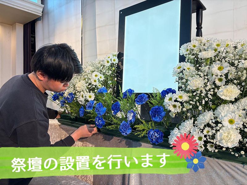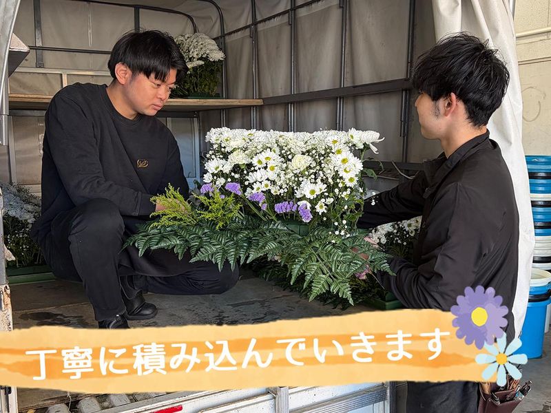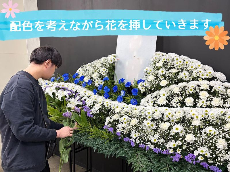 仕事内容 「お花で、より故人様との最後の時間を大切な思い出に」 あなたにしか創れないお花で、より印象的なお時間を過ごしていただきませんか? 当社はお客様やお集りの皆様に、大切なお時間を印象深く心に残る思い出としていただけるようにお手伝いさせていただくという仕事であります。 あなたらしさを一緒にお花を通じて表現していきませんか。 今回の募集では、ご遺族から大切な方に贈る最後の贈り物を手掛けるお仕事です。 私たちフューネラルフラワーコーディネーターはこう考えます。 ご葬儀に飾る花祭壇やお花はどなたのために飾るのでしょうか。故人様だけではありません。 お花を見て嬉しそうに涙ぐむご家族。 「お花綺麗だね」と話すお集まりの皆様、お花はお別れの時にお集まりいただいた皆様のため、お気持ちを○○するために飾るのではないでしょうか。 具体的には ・生花祭壇の作成および設営 ・ご葬儀に付随するご供花、アレンジメントの作成、設営 ・祭壇や装飾品の配送、撤収 ・下準備や水替え等の生花の在庫管理 <基本的な仕事の流れ> ▼受注担当者からのご依頼 ▼ご依頼商品の作製 ▼供花や祭壇用のお花を社用時に積み込み式場へ ▼式場で備花や祭壇の飾りつけ ▼告別式の立ち合いや終了後の撤収作業 ▼翌日の準備をして終了 ※当店の担当エリアは基本的に東京西エリア4会館です。 ※いわゆる「販売店」ではないので、店舗接客はほとんどありません。 ※身体を動かすことが好きな方も活躍できます! ★アイデアを活かせる場面も! 葬祭部からは、ご葬儀関係のみならず集客用の展示会に飾るお花を依頼されることも。 ご葬儀関係のお花づくりに比べデザインの自由度が高いので、アレンジメントの腕を発揮し、アイデアを発揮することができます。 希望するスタッフにはご葬儀関係以外の仕事に携わる機会もあります。