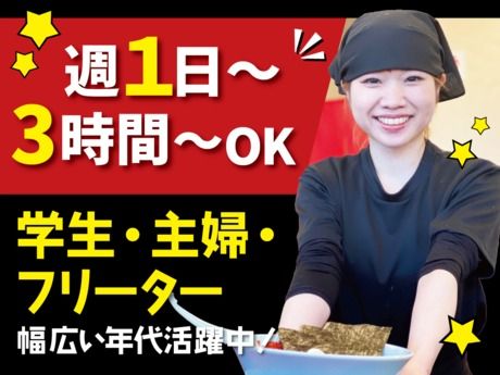仕事内容 【4/22オープン】入社後、随時研修スタートOK! \\ オープニングスタッフ大募集 // オープニング手当200円/時間(6月末まで) 【 1時間あたり1500円(高校生1400円) 】 オープニング期間なら、月収27万2500円 (夜勤1日8h・週5日勤務の場合) <<学生・主婦(夫)・フリーター歓迎>> お店を一緒に盛上げてくれる仲間を大募集! みんな一緒のスタートだから 未経験も安心してご応募くださいね! \\ 入社後よりオープン前研修開始 // 3/2~4/8は「福岡松島店」にて研修可能です! 4/11からは「福岡月隈店」でも研修開始です! ※4/22以降の入社も大歓迎です!! ※研修期間:オープンまで(条件変更なし) * 【主な仕事内容】 ラーメン店での ホール・キッチン業務をお任せします。 食券制なので、面倒なレジ作業はありません! 初心者の方でもはじめやすいのがポイント! <下記のみの働き方もOKです> ・駐車場警備員スタッフ ・清掃スタッフ ・仕込みスタッフ ※時給は同じ!募集時間は全時間帯 【大学生・主婦・主夫歓迎!】 家事・育児・学業・他の仕事と両立しながら 好きな時間に働けると大好評! ガッツリ稼ぎたいフリーターも、もちろん大歓迎! 『週1日~OKで、子どもの予定にも合わせやすい』 『学校行事や私用でのお休みもしっかり取れる』 『深夜時給で効率良く稼げるので収入も安定』 …など、プライベートと無理なく両立している 主婦・学生・フリーターが多数活躍しています! 10代~50代・60歳以上まで 幅広く在籍しているのが丸千代山岡家の特徴! 若手~中高年・シニアまで応援しています! \ この求人のポイント / 《1》働く時間や曜日が選べる 私生活に合わせて勤務可能! 自分に合った働き方を実現できます! 《2》まかないあり! まかないでおいしいラーメンや その他メニューが食べられます! 《3》制服貸与あり/髪色自由 出勤時/退勤時の服装は自由です! オシャレに気を抜かずに働けますよ! <未経験者も安心*ブランクOK> 社員がイチから丁寧に教えるので、 初バイト・パートも安心! 経験・年齢不問!やる気があればOKです! 【経験者ももちろん歓迎】 レストラン・ラーメン店・居酒屋・ カフェ(喫茶店)・スーパー・ドラッグストア・ アパレルなどの経験者は、即戦力として活躍可能! 今までの経験を生かしてみませんか? <こんな仕事を探している方にオススメ> *早朝 or 夜間のアルバイト・パート *ランチのみ or 夜のみの副業・Wワーク *平日のみ or 土日祝のみで働ける仕事 ―>全部OK! 24時間希望シフトで働けます! 【株式会社丸千代山岡家*全国190店舗以上展開】 <東証スタンダード上場企業の安定基盤> 《設立》1993年(創業30年) 《従業員数》6522名(内正社員654名) ※2025年1月31日現在 《事業内容》 「ガツンときて、くせになる」 ラーメン店山岡家運営 《ホームページ》 https://maruchiyo.yamaokaya.com/
