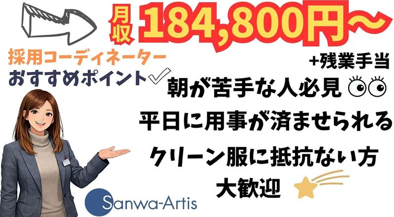 仕事内容 ✅食品業界未経験者さんでも安心☆ ✅40代・50代の方大活躍中! ✅嬉しい時給1200円 13:00~の遅め出勤で 平日に用事を済ませられちゃう♪ 私たちと一緒に見学だけでも 行ってみませんか? ━━━━━━━━━━━━━━━ 【お仕事内容】 ━━━━━━━━━━━━━━━ 食品を通す機械をきれいにするお仕事 ✅具体的には…  ̄ ̄ ̄ ̄ ̄ ̄ ̄ ̄ ■機械のパーツを外す ■洗浄機で洗い流す ■パーツをつけなおす 難しい作業はなく、超単純作業! 作業手順さえ覚えてしまえば あとは自分のペースで作業できます◎ 身体を動かすお仕事なので じっとしているのが苦手という方必見! 先輩スタッフが優しく丁寧に教えてくれて 安心してお仕事が始められる環境です♪ 「お仕事が気になるなぁ」 「実際に会社の中を見てみたい」 という方は、 応募前の職場見学もありますので、 お気軽にご相談ください! *20代~60代男性活躍中* *・。*。・*+*・。*。・*+*・。*。・* このお仕事のおすすめポイント☆ *・。*。・*+*・。*。・*+*・。*。・* ■シフト制 ■研修制度充実の職場で安心◎ ■無料駐車場完備 ■かんたん作業* ■未経験者さん大歓迎! ■アットホームな職場 ■各種保険完備 └即日加入可能(規定あり) ■資格や学歴、経験は一切不問 ■スピード面談&スピード採用あり ■即日入社OK♪ ■応募前、職場見学随時実施中 └お気軽にご相談ください ■オンライン面談あり └スキマ時間を使って応募OK オンライン面談随時受付中◎ お仕事のご相談だけでもお気軽にどうぞ! 皆様にお会いできることを 心より楽しみにしております♪ サンワアルティススタッフ一同より