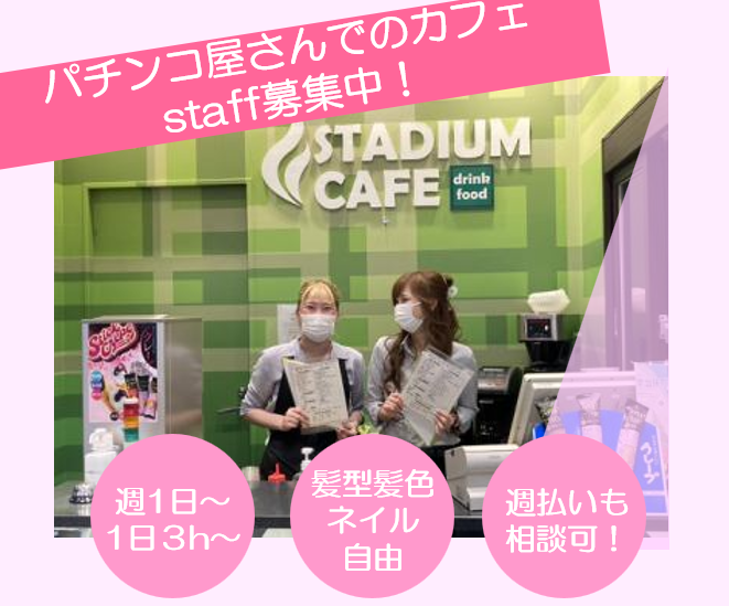 仕事内容 ✨時給1200円✨ ◆注文を受けたコーヒーやソフトドリンク・パン等をお客様の台まで運ぶお仕事です♪ ◆未経験でも笑顔で対応できればOK☆ ◆先輩staffがしっかり教えていきます! ※健康増進法による受動喫煙対策のため20歳以上の方の募集になります ー✨ここで働く魅力✨ー ◆フリーターの方大歓迎!シフトは11〜19:30もしくは15:30〜20:15まで ◆かけもちももちろん大歓迎! シフトは15:30〜19:30もしくは15:30〜20:15まで。 週1日から大丈夫! 土日祝日勤務できる方、17時から働ける方、大歓迎! ◆自分のライフスタイルにあった働き方が可能! ◆常連のお客様が多い! ◆社員の方の面倒見抜群!研修等もしっかり行いますので未経験の方も安心! ◆普段からパチンコをされている方はパチンコの話で盛り上がれること間違えなし! ◆もちろんパチンコをしたことないスタッフもいますのでご安心を〇 ◆おしゃれを楽しみながら働けます!髪色/髪型/ネイルもちろんOK!✨個性出していきましょう!✨ ✨実際のスタッフさんの声✨ ◆スタッフ同士の仲がとにかくいいです! ◆「仕事を通じて交友関係を広げたい」「趣味程度にパチンコはやっていた」「合間時間で働ける!」きっかけはさまざま!☆
