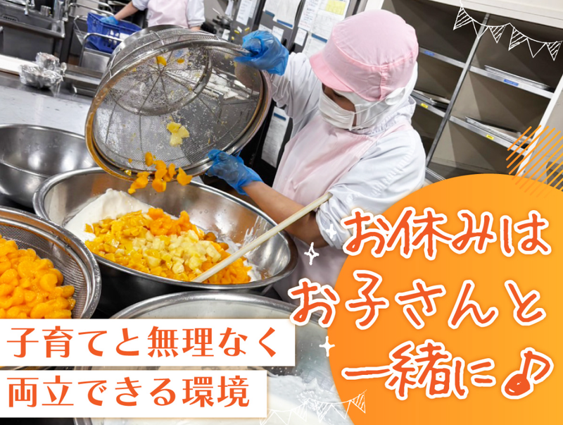 仕事内容 【無資格・未経験でも大丈夫★*】 土日祝休み&週3日~OK! 主婦さんやフリーターさん活躍中♪ ★━━━━━━━━━━━━━━━━ 当施設のイチオシpointを紹介 ━━━━━━━━v━━━━━━━★ ✅ 無資格・未経験でも大丈夫! 普段の家事の延長で始められる♬ ୨୧┈┈┈┈┈┈┈┈┈┈┈┈┈┈┈┈┈୨୧ ✅ 日勤のみ* 家庭や家事との両立にもぜひ! ୨୧┈┈┈┈┈┈┈┈┈┈┈┈┈┈┈┈┈୨୧ ✅ 週3日~OK〈土日祝休み〉 お休みがお子さんと一緒で安心♪ ୨୧┈┈┈┈┈┈┈┈┈┈┈┈┈┈┈┈┈୨୧ ✅ 正社員登用あり! 将来を見据えて安定したい方にもお勧め ୨୧┈┈┈┈┈┈┈┈┈┈┈┈┈┈┈┈┈୨୧ *★⸜ 人柄重視の採用中! ⸝★* 経験や資格よりも人柄を重視しています!  ̄ ̄V ̄ ̄ ̄ ̄ ̄ ̄ ̄ ̄ ̄ ̄ ̄ ̄ ̄✿* ̄ ̄ 子どもたちの「おいしい!」 の笑顔に出会える、 やりがいのあるお仕事です。 ▼具体的には… ・給食の調理業務全般 └食材のカット 煮物・焼き物・和え物などの調理補助 その他、不随する業務全般 ・食器や器具のセッティング ・クラスごとの配膳作業 ・下膳後の食器・食缶・器具の洗浄作業 ・調理場の清掃作業 など 子どもたちの健康と笑顔を 一緒につくってください*。٩(ˊᗜˋ*)و*。 普段の家事スキルで充分ですよ!! 少しでも気になった方は、 お気軽にまずはお問い合わせ下さいね★