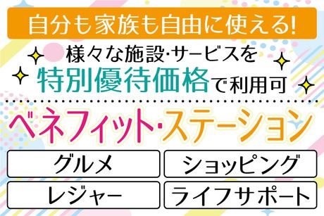 【保険制度】 雇用保険、労災保険、健康保険、厚生年金 待遇・福利厚生 【福利厚生】 ・社会保険完備 ・有給休暇 ・週払いOK(規定) ・交通費全額支給 ・車、バイク、自転車通勤OK ・無料駐車場あり ・制服貸与 ・髪色自由 ・ノーメイクOK ・食堂あり 【その他福利厚生】 ・定期健康診断 ・教育訓練制度 ・子ども手当あり ・結婚、出産、入学祝い金あり ・退職金制度あり ※各々、社内規定に基づく 【ベネフィット・ステーションの利用が可能】 ベネフィット・ステーションとは、 様々なシーンでご利用いただける 総合型福利厚生サービスです。 映画鑑賞やホテルディナー、宿泊施設 などの余暇・レジャー関連をはじめ、 日常で使えるフィットネスや 育児・介護支援、ライフサポートなど 約140万件以上の幅広いメニューを お得な価格で利用できます。 <サービス例> ・全国40,000以上の宿泊施設 ・全国30,000店舗以上の飲食店 ・全国約7,700ヶ所のスポーツクラブ など スタッフさんはもちろん、ご家族の方もお好きなだけ利用できます。