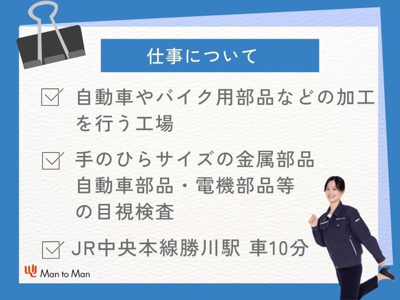 仕事内容: 【職種】 自動車や電機部品の目視検査 【仕事内容】 \ おススメ案件です!! / ☆彡・。.・゜゜・。.・彡☆ 子育て世代も 活躍できるお仕事♪ 4時間勤務で、 週4~OK!!!! ☆彡・。.・゜゜・。.・彡☆ 【 お任せしたいお仕事 】 手のひらサイズの金属部品 (自動車部品・電気機器部品等)を 目視で検査を行っていただきます。 / 基本、座り作業~(^▽^) \ 嬉しいポイントの1つですよね!! 具体的には・・・ ✅製品にキズ、へこみがないか確認 ✅メッキ(部品の表面処理)にムラがないか 確認して、有るもの/無いものを選別 ・空調も完備しておりますので、 いつでも快適にお仕事に取り組めます! ・未経験から始められた方も 多数在籍中! ・丁寧な研修もございますので 安心して就業できますよ!! 集まり次第終了となってしまいますので 少しでも気になった方はまずご応募下さい♪ 皆様のご応募、心よりお待ちしております!!