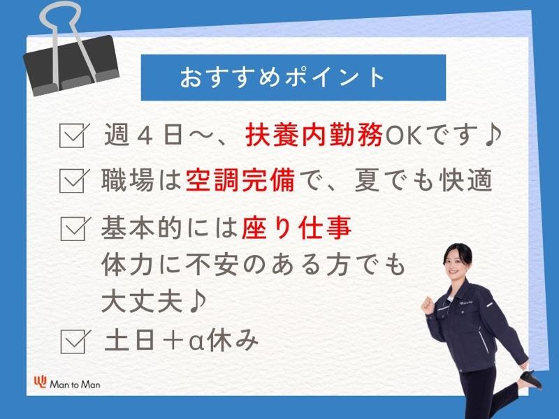 求める人材: 【応募資格】 未経験OK/ブランクOK \☆特別な知識やスキルは一切不要☆/ 派遣先では未経験からスタートした方も たくさんいます。 ーーーーーーーーーーーーーーーーーーーー Man to Manでは以下の様なスタッフさんが 働いています。 ・異職種から転職された方 ・経験を活かして働きたい方 ・初めて工場ワークされる方 ・扶養内で働きたい方 ・短時間で働きたい方 ・女性活躍中の職場で働きたい方 ・20代、30代、40代活躍中の職場で働きたい方 ・プライベートを充実させたい方 ・年間休日120日以上の職場で働きたい方 ーーーーーーーーーーーーーーーーーーーー Man to Manには、 ハローワークや一般求人誌には掲載されて いないお仕事情報もたくさんありますので、 まずはお気軽にお問合せください。