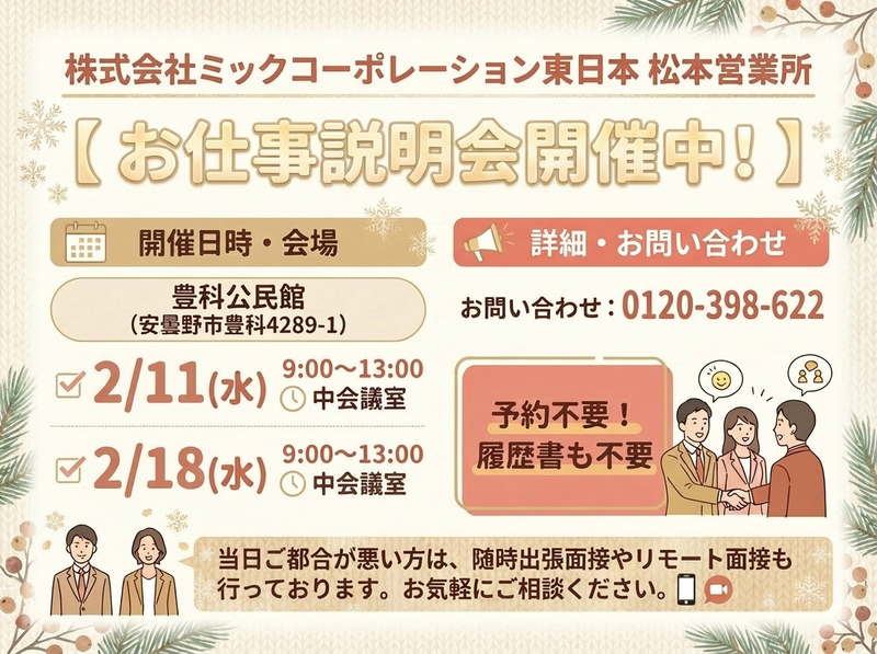 選考プロセス (1)お電話でのご応募 まずはお気軽にお電話ください。 (2)応募ボタンからのご応募 WEB応募からのご応募は24時間受付可能です。 応募確認が出来次第、折り返しご連絡させていただきます。 【登録地】 株式会社ミックコーポレーション東日本 松本営業所 所在地:長野県松本市島立1094-1 上條ビル201