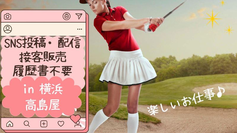仕事内容 駅直結『横浜高島屋』勤務! カワイイ制服支給あり♪ 『スマホ』で簡単WEB面談、即日面談対応! 【お仕事内容】 ・接客販売 ・在庫管理 ・SNS投稿用の写真撮影 ・SNS配信 ゴルフウェアの接客販売と SNS投稿用の写真撮影や配信をお願いします。 ✨ゴルフ未経験歓迎✨ クラブ販売なし! ウェアと雑貨販売の為難しい知識不要です! (^^)/カワイイウェアを着たい♪ (^^)/SNSが好き♪ そんな方も歓迎です。