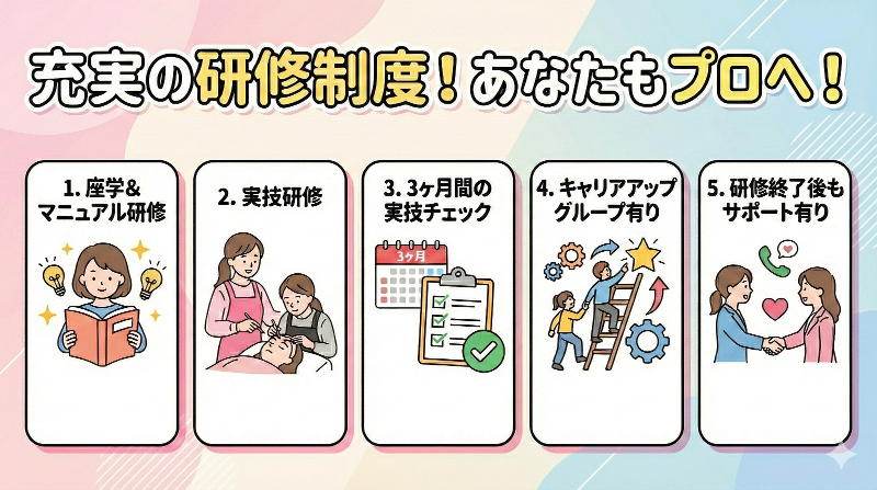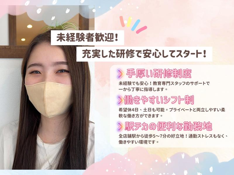 アピールポイント: 社風 ゚ ゜゚*☆マンツーマンスタイル☆*゚ ゜゚ マンツーマンスタイルでのびのびと働けるサロンです。同時施術や掛け持ちがなく、目の前のお客様に集中できます。また、ネイルや髪色が自由で、個性を活かしながら働ける環境です。SNS更新業務の負担がない点も、スタッフにとって働きやすいポイントです。 制度・環境 ゚ ゜゚*☆充実したサポート☆*゚ ゜゚ 未経験の方やブランクがある方も安心してスタートできるよう、サポート体制を整えています。さらに、独立開業支援もあり、将来のキャリアを見据えた働き方が可能な環境です。また、客単価は約9千円で、フリーのお客様も多く来店されるため、入客のチャンスが豊富です。