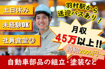 仕事内容 高時給2000円、月収45万円×12か月で年収540万円以上も可!?積極採用!30名の大量募集◎履歴書不要◎無料送迎バスあり!夜勤時は青梅~昭島まで各駅停車!未経験から始めた30代男性活躍中! <仕事内容> 大手自動車(SUV車・小型トラック)の製造工場 【組立ライン】 工具(インパクトや電動ドライバー)を使用して、ネジやボルトなどの車両部品を組み付け作業 【部品供給】 部品のピッキング、それぞれのラインへ部品を運び、空箱の回収作業 【塗装ライン】 車両部品へのスプレー塗装、色ムラや汚れなどの目視検査を行います。 【車体ライン】 部品の加工機械のオペレーター、半自動溶接のオペレーター作業。イメージとしてはロボットの補助作業。 いずれかの部署に適正をみながら配属となります。 ※未経験から始めた方も多数在籍!指導員がしっかりと教育してくれますので安心です。 ライン作業でのお仕事です。 立ち作業となります。 重量物を扱う(15㎏以上)可能性がございます。 グループ作業となります。 《職場環境》 男性が多い職場です。 CDP派遣スタッフが在籍中です。 外国籍の方が活躍中の職場です。 ロッカー有り|休憩室完備 アピールポイント <仕事内容> 大手自動車(SUV車・小型トラック)の製造工場 【組立ライン】 工具(インパクトや電動ドライバー)を使用して、ネジやボルトなどの車両部品を組み付け作業 【部品供給】 部品のピッキング、それぞれのラインへ部品を運び、空箱の回収作業 【塗装ライン】 車両部品へのスプレー塗装、色ムラや汚れなどの目視検査を行います。 【車体ライン】 部品の加工機械のオペレーター、半自動溶接のオペレーター作業。イメージとしてはロボットの補助作業。 いずれかの部署に適正をみながら配属となります。 ※未経験から始めた方も多数在籍!指導員がしっかりと教育してくれますので安心です。 ライン作業でのお仕事です。 立ち作業となります。 重量物を扱う(15㎏以上)可能性がございます。 グループ作業となります。 《職場環境》 男性が多い職場です。 CDP派遣スタッフが在籍中です。 外国籍の方が活躍中の職場です。 ロッカー有り|休憩室完備 \充実した福利厚生/ ◎送迎バスあり ◎社会保険・雇用保険完備 ◎有給休暇有(6ヶ月経過後、10日付与)※規定あり ◎残業手当 ◎深夜手当 ◎交通費支給(規定内) ◎確定拠出年金制度 ◎お友達推薦制度あり(規定有り) ※1名につき3万円~10万円臨時給与として支給 ◎社員食堂あり ◎食事持参可 ◎福利厚生プログラム (宿泊、グルメ、ショッピングなど大幅割引が受けられる10万アイテムのメニューがあります)