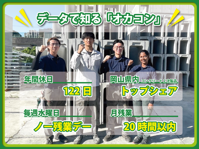 仕事内容 ▶営業経験を、もっと「長く働ける環境」で活かしませんか?◀ 「今の仕事は土日も気が休まらない」 「数字のプレッシャーが強すぎる」 そんな悩みを持つ営業経験者の方へ。 創業60年超、岡山トップクラスの シェアを誇る「オカコン」で、 地域インフラを支える誇りと、 自分自身の時間を両立させる働 き方を提案します! ■仕事の概要:既存顧客への提案営業  ̄ ̄ ̄ ̄ ̄ ̄ ̄ ̄ ̄ ̄ ̄ ̄ ̄ ̄ ̄ ̄ ̄ ̄ ̄ 官公庁、設計コンサルタント、 建設業者に対し、道路や水路に使われる 「コンクリート2次製品」の 提案・販売を行います。 ●既存顧客が中心 ┗ 1人30社程度を担当。 長年の付き合いがある お客様がほとんどです。 ●飛び込みなし ┗ 新規は問い合わせ対応がメインです。 信頼を積み重ねるスタイルです。 ●現場での打ち合わせ ┗ 製品納入の管理や、 現場での細かな調整も行います。 ■ここが「オカコン」で働くメリット!  ̄ ̄ ̄ ̄ ̄ ̄ ̄ ̄ ̄ ̄ ̄ ̄ ̄ ̄ ̄ ̄ ̄ ̄ ̄ ●ワークライフバランスの徹底 ┗ 週休2日制 (土日祝 / 繫忙期は土曜日出勤あり) 年間休日は122日で 毎週水曜は「ノー残業デー」です。 家族との時間や 趣味の時間をしっかり確保できます。 ●効率的な営業スタイル(DX推進) ┗ 営業には1人1台 PCとスマートフォンを支給。 出先でも書類作成や 連絡がスムーズにできるため、 「事務作業のために会社に戻る」 無駄を省いています。 ●ノルマではなく「目標」をチームで追う ┗ 個人の数字で詰められる文化はなし。 営業6名(20代〜50代)が協力し合い、 チームで目標を達成する風土です。 ■建設業界ならではのやりがいと手応え  ̄ ̄ ̄ ̄ ̄ ̄ ̄ ̄ ̄ ̄ ̄ ̄ ̄ ̄ ̄ ̄ ̄ ̄ ̄ お客様は建設のプロです。時には 厳しい言葉をいただくこともありますが、 それは現場を預かる責任感の裏返し。 誠実に対応し、顔を覚えてもらうことで 「次もオカコンさんにお願いするよ」と 頼られる瞬間は、 この仕事ならではの醍醐味です。 ■入社後のフォロー体制  ̄ ̄ ̄ ̄ ̄ ̄ ̄ ̄ ̄ ̄ ̄ ̄ ̄ コンクリートの知識がなくても大丈夫です。 ●3ヶ月の充実研修 ┗ 工場や他部署での実習を通じて、 製品が作られる工程を学びます。 ●先輩同行でのOJT ┗ 営業の基礎や、お客様との 関係性の築き方を丁寧に伝授します。 ●20代・30代も活躍中 ┗ 直近でも20代の男性が 未経験から入社し、活躍しています。 ■募集の背景  ̄ ̄ ̄ ̄ ̄ ̄ ̄ ̄ ̄ ̄ ̄ ̄ ̄ 欠員に伴う募集ですが、私たちはこれを 「次世代のコアメンバー」を 迎えるチャンスと考えています。 地域に根を張り、安定した基盤の上で 営業スキルを磨きたい方、 ぜひ一度お話ししましょう! まずは会社の見学にお越しください!