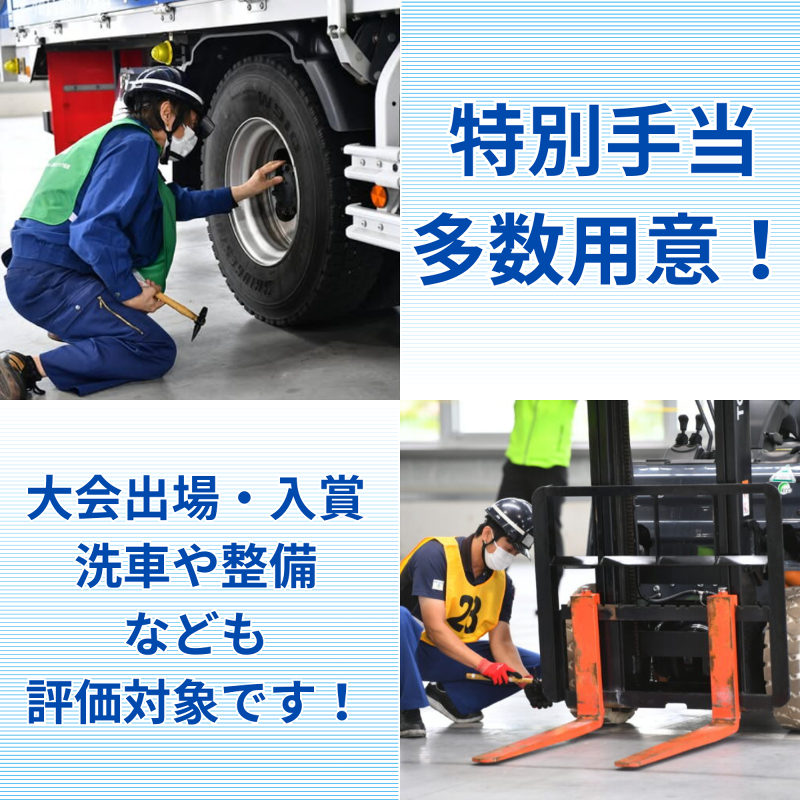 【保険制度】 雇用保険、労災保険、健康保険、厚生年金 待遇・福利厚生: ■昇給年1回 ■賞与年2回(7月・12月)◎毎年支給しています! ■交通費(上限月1万3000円) ■社会保険完備(雇用・労災・健康・厚生年金) ■時間外手当(全額支給) ■住宅手当(月5,000円) ■家族手当(配偶者:月11,000円、子ども1人につき:月2,000円) ■役職手当 ■職能手当 ■報奨金 ■皆勤手当 ■整備手当 ■通信手当 ■車orバイク通勤OK(駐車場完備) ■退職金制度(入社3年目以降に適応) ■資格取得支援制度(中型・大型免許、リフト/会社規定による) ■制服貸与(ワンシーズン) ■オフィス内禁煙 ■ U・Iターン支援あり