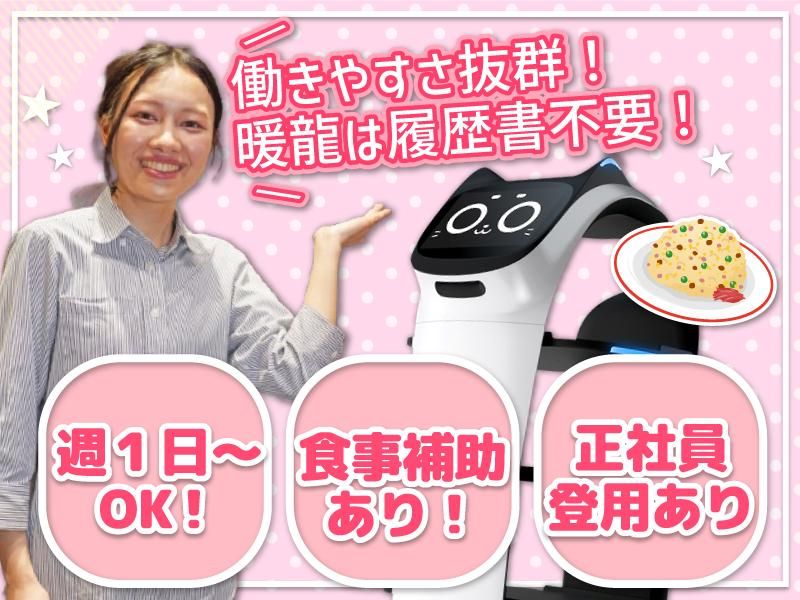 仕事内容 / 週1~5日まで希望のシフトで勤務可能! シフトは毎週作成>希望日に休みが取れます✨ \ 本格中華を気軽に食べられる「暖龍」で、 ホール担当のアルバイトスタッフを大募集! 今回は週1~2日程度働きたいWワーカーさんや 週4~5日出勤が可能なレギュラー勤務さんまで、 幅広く新メンバーを大募集しています! 【具体的なお仕事は】 暖龍のスタッフとして、「ホール」のお仕事をお任せ! お客様のご案内やお会計など、 飲食店での簡単な接客のお仕事です。 最初はテーブルのセットなど、 接客が無いお仕事からお任せするので、 未経験の方もご安心ください! >仕事は優しく丁寧にお教えします! 挨拶や食器を運ぶお盆の持ち方など、 基本からしっかり教えします。 お客様にお声がけするタイミングも 「あそこのお客様今大丈夫!」など、 先輩が教えてくれるから安心です。 >料理の提供はロボも手伝います! 配膳用のロボットも導入しているため、 お席のご案内やテーブルの準備などがメインとなります! ー 【働き方の希望は柔軟に対応します】 お仕事は週1~5日、1日4時間~OK! 基本的には平日17:00~22:00/土日祝10:00~22:00の 上記2パターンの時間帯での勤務となりますが、 しっかり稼ぎたい方は週5日、1日8時間のフルタイムなど 希望に応じたシフトにて勤務していただけます。 本業の合間にサクッと働きたいWワーカーさんも、 レギュラー勤務希望のフリーターさんも どなたでも大歓迎です! また、シフト希望は1週間毎の自己申告制のため、 「今週この日はお休みが欲しい!」などの希望も 柔軟に対応することができるので、プライベートも充実できます! 【正社員として働きたい方も歓迎!】 今回はアルバイトスタッフの募集ですが、 社員として働く選択肢もしっかりとご用意しています! (1)アルバイト > 準社員(契約社員/店舗固定) > 正社員 (2)アルバイト > 正社員 上記2通りの社員登用制度を設けています。 転勤無しで働きたい方は準社員のまま働き続けるのもOK! 店長などキャリアアップも見据えたい方は正社員を目指すのもOK! ライフスタイルやキャリアビジョンを見据えて働けるのが特徴です✨