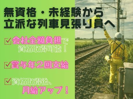 「列車見張り員」の資格をお持ちの方歓迎!無資格の方もOK⇒入社後に”会社負担”で資格取得を目指せるので、資格を今お持ちでない方もお気軽にご応募下さい。イチから学んで取得し、現場で活躍することも可能!資格をお持ちの方には、これまでの経験を活かせるのはもちろん、給与面でも優遇(月給25万2000円~)します。また、無資格者の方が当社バックアップの下、資格を取得された場合も、有資格者と同じく月給面考慮致します。待遇・福利厚生も充実した環境でじっくり腰を据えてお仕事しませんか!