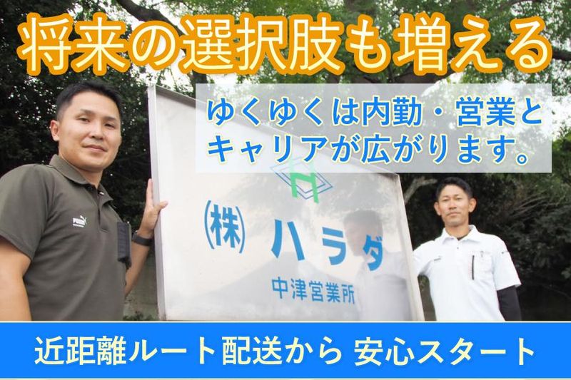 仕事内容 「毎日決まった時間に終わる仕事がいい」 「地元で安定して長く働きたい」 そんな方に向けた、 近距離ルート配送が中心のお仕事です。 配送業務を通して 商品やお客様との関わりを深めながら、 将来的に仕事の幅を広げることも可能な環境です。 ========================================== 【この仕事の魅力】 ✅地元中心・近距離のみのルート配送 長距離運転はなく、決まったエリアへの配送が中心。 生活リズムを大切にできます。 ✅ 未経験から安心してスタート 先輩社員が同行しながら丁寧にサポート。 普通免許があれば始められます。 ✅年間休日130日×残業ほぼなし 土日祝休みで、17:30退社も可能。 プライベートとの両立がしやすい職場です。 ✅将来の選択肢が広がる 配送を通じて商品やお客様を知る中で、 希望があれば内勤業務や お客様対応を含む仕事に挑戦することもできます。 ========================================== 【仕事内容】 ・中津市内・周辺エリアへの配送 ・社用車(1.5tトラック)での運搬 ・倉庫での積み込み・資材の受け渡し ・配送先での簡単なご挨拶・対応 ※慣れるまでは先輩社員が同行し、 業務の流れを一つずつ覚えていきます。 ※将来的には、 配送+簡単なサポート業務、営業職へのキャリアチェンジなど、 本人の希望に応じて役割を広げることも可能です。 ■当社の採用サイトです 働いているメンバーの雰囲気等を是非ご覧ください https://site9.saiyo-dekirukun.com/harada ========================================== 【最後に】 この仕事は、 「黙々と運ぶだけ」ではありません。 日々の配送を通して、 自然と人との関わりや 仕事の理解が深まっていきます。 まずは配送から、 その先はあなたのペースで。 安定した環境で、 長く働きたい方をお待ちしています。