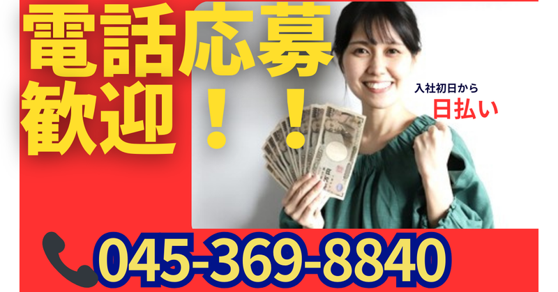 選考プロセス 電話応募を推奨しておりますので、 下記電話番号までご連絡お待ちしております。 「求人募集を見た」と言って頂けると話が早いです! ※WEB応募も歓迎しますが、 少し連絡が遅くなる事が恐れがあります。 【応募受付電話番号】 045-369-8840 (月~金/9~17時)