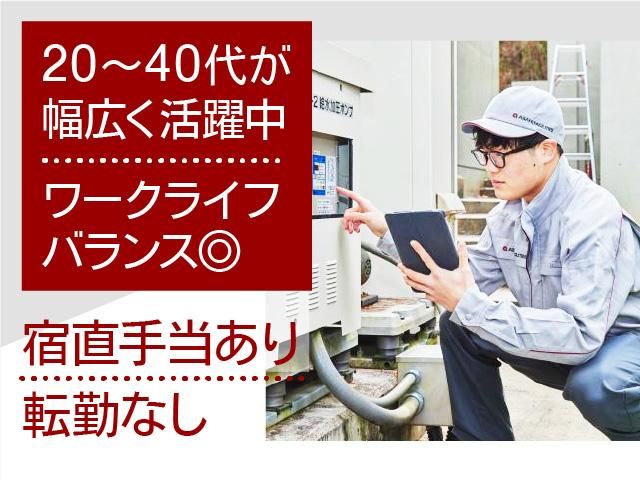 年間休日123日/月9日以上休み/賞与年2回(3.4~5.2ヶ月分)/宿直手当あり 将来に向けて頑張りたい方はぜひご応募を! <20代・30代・40代の幅広い人材が活躍中> 設備保守・メンテナンスの実務経験が必要ですが 3年程度あればOKです! ICT技術を活用した最先端のシステムも取り入れており 設備保全の仕事を通して成長できます。 また総合技術者としての育成や資格取得支援の応援、 キャリアパスの実現に向けた教育研修制度もあり 経験を活かしつつもさらなるステップアップを目指せます。 < ワーク・ライフ・バランス良好 > 勤務時間や残業、休日など 無理なく続けられる労働環境を整備。 コンプライアンスを徹底しているため安心して働けます。