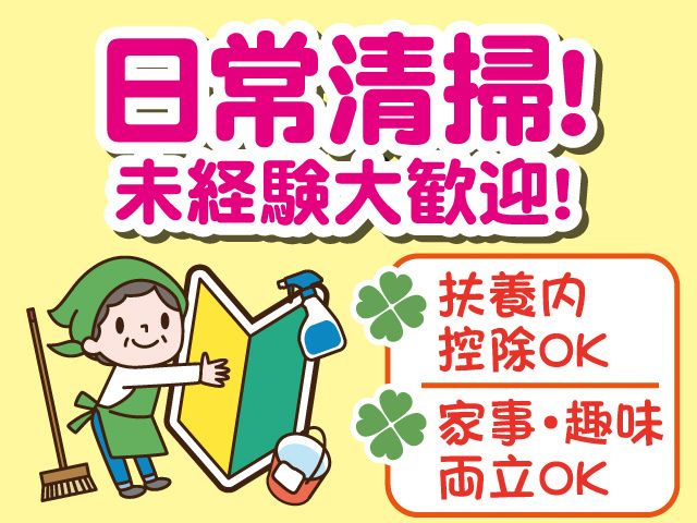 仕事内容 東船橋駅より徒歩7分の場所にある自社グループ会社の オフィスビルのカンタン日常清掃業務 【おすすめポイント】 ・土日祝休み ・東船橋駅近く ・交通費全額支給 ・8:00~12:00の午前中の業務 ・扶養範囲内勤務OK ・未経験大歓迎 ・室内での作業が多く、暑い季節でも安心 ・同じグループ会社(京葉ガス)のビルなので雇用安定 【お仕事内容】 ご自宅でのお掃除の延長でできる日常的なお掃除 ・ゴミの回収・ゴミ捨て ・トイレ清掃 ・共用廊下の掃除機掛け など 未経験でもすぐに覚えることができる内容ですので 慣れてしまえばコツコツ、もくもくとお仕事に取り組めます。 【無理なく長くお勤めできます】 朝の4時間のお仕事 なので、パート・アルバイトデビューにも最適! 扶養内勤務もOK フルタイムは無理だけど、ちょっとだけ働きたい、 という方にぴったりのお仕事です。 土日祝、年末年始休み 週末はしっかり休みたい方、お子さんの休日に合わせたい方、など 平日も、家庭の事情など急にお休みが必要になった時は、皆で調整できます。 興味を持っていただいた方、 お電話でもご質問やご応募は受け付けております。 047-322-6411 ぜひお気軽にお問い合わせください。