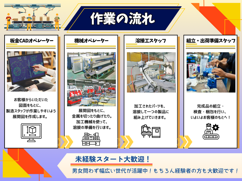 仕事内容 \\未経験歓迎!働きやすさ◎// ✨【板金CADオペレーター募集】✨ お客様からいただいた図面をもとに、製造スタッフが作業しやすいように展開図を作成するお仕事です♪ ✅未経験歓迎!経験者優遇!安心のサポート体制完備◎ ✅週休2日制&長期休暇あり!プライベートも充実◎ ✅創立1970年の安定企業!幅広い世代が長期で活躍中◎ ✅髪色自由・ピアスOK!自由度の高い職場です◎ ✅資格取得支援制度あり!会社負担で手に職がつきます◎ ✅和気あいあいとしたアットホームな雰囲気の職場◎ ✅昇給・賞与+手当あり!福利厚生も充実◎ ⏰『Instagram /TikTok』始めました! 【親和工業株式会社】もしくは【shinwa.industry.co】で検索♪ ≪⏬どんな会社?≫ 私たち親和工業は、農業機械や穀物用コンテナをはじめ、居酒屋用冷蔵庫の部品や食洗機の土台などの製造を手がける、開発型のものづくりを行なっている企業です! 「人に役立つものづくり」を大切に、技術を磨き、時代のニーズに応える製品を全国に届けています。 ≪⏬仕事内容≫ お客様から届いた図面をもとに、板金用の展開図をCADで作成します! 産業機器関連の図面が中心で、リピートのお仕事も多め!慣れればスムーズに進められます♪ ⏰1日のスケジュール例 ▼8:00|出社 ラジオ体操&朝礼で1日が始まります! ▼8:15|業務開始 その日の仕事を整理して図面作成スタート! ▼10:00|小休憩(5分)ちょっと一息♪ ▼10:05|図面作成 引き続き集中して作業! ▼12:00〜12:50|お昼休憩(50分) 休憩室でゆっくりしたり、外にランチも◎ ▼12:50|午後の業務開始 引き続き図面を仕上げていきます! ▼15:00|小休憩(5分) ちょっと一息♪ ▼15:05|図面作成 残りの仕事を進めていきます! ▼17:00|業務終了!おつかれさまでした✨ 1日に3件ほどのお仕事を担当し、他部署ともコミュニケーションを取りながら進めています! 最近は新規のご依頼も増加中!幅広い図面に携われるのでスキルアップにもつながります◎ 社内にはマニュアルもあり、先輩スタッフがしっかりフォローするので未経験でも安心です! ≪⏬社員インタビュー≫ *入社3年目/Sさん* Q:入社のきっかけを教えてください! A:前職も板金関係の会社で、資材の購買や手配など営業事務をしていました。 もともと図面を描くのが好きで、「いつか設計の仕事に挑戦したい!」と思っていたんです。 土木やものづくりの分野にもずっと興味があって・・。 そんな時にハローワークで親和工業の求人を見つけ、「ここなら好きなことを仕事にできる!」と思い入社を決めました! Q:実際に働き始めてみて、いかがですか? A:設計は完全に未経験だったので最初は不安もありましたが、入社後1ヶ月は先輩がマンツーマンでついて、基礎からしっかり教えてくれました。 分からないことがあっても、部署に関係なくみなさんがすぐに教えてくれるので、とても心強いです! 未経験でも安心してスタートできる環境だと感じています。 Q:仕事のやりがいや嬉しい瞬間はどんなときですか? A:やっぱり、自分が設計したものが実際に完成したときが一番嬉しいです! 立体にするのは難しいところもありますが、その分できあがったときの達成感は格別。やりがいを感じられます。 Q:職場の雰囲気はいかがですか? A:みなさん本当に優しくて、部署を超えて気軽に話せる雰囲気があります。 自然にコミュニケーションがとれるので、居心地が良い職場です。 気づけばあっという間に3年が経ちました! 人間関係も続けるモチベーションになっています!
