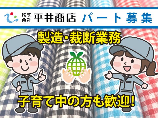 仕事内容 【玉村町/裁断・製造/パート】 群馬県佐波郡玉村町にあります 『株式会社平井商店』にて パートスタッフを募集します! < おすすめポイント > ・未経験OK! ・扶養内勤務可! ・完全週休二日制! ・土日祝休み ・子育て世代活躍中! ・勤務時間、日数相談可! (1日5h〜、週3日から勤務OK) ・子ども都合のお休みOK 【募集職種】 パート/裁断・製造 < 仕事内容 > 廃品のシーツ・衣類・タオルなどを 電動カッターで裁断して ハンカチくらいの大きさの 「ウエス」にします。 ※工業用ウエスとは・・・ 製造工場や整備工場などで使用される 使い捨て(もしくはレンタル)の 「ぞうきん」のことです。 お仕事は丁寧にお教えますので 未経験の方でも 安心してスタートできます! 【勤務地】 玉村町 ※その日の業務量等により、伊勢崎営業所で 働いていただく可能性もあります。 < 勤務日・時間相談可! > 「子育て中なのでフルタイムは厳しい」 「扶養の範囲内で働きたい」 そんなお悩みを持った方必見です! 子育て中の方も在籍していますので、 勤務日数、勤務時間は お気軽にご相談ください! < 嬉しい土日祝日休み! > こちらの募集は土日祝休みの 完全週休2日制となっています! そのため、子育て中の方や 主婦(主夫)の方もお仕事がしやすく、 家庭との両立もしやすいですよ! <環境にやさしいお仕事!> 当社は使わなくなった衣類などを リサイクルして再利用をするために 加工する会社です。 働くことで地球環境に貢献できる、 未来あるお仕事です!