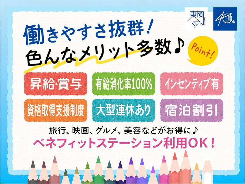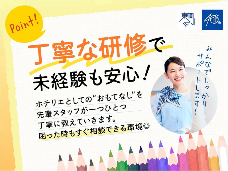 求めている人材 ⏩未経験OK 英語スキルがなくても大丈夫☕ 簡単なPC操作ができる方歓迎❗ ※業務で日本語の読み書き・ 会話を日常的に行うため、 日本語を母語話者と同等レベルで 使用できる方 《 こんな方におすすめ 》 ⭐接客・販売経験を 新しいキャリアに活かしたい方 ⭐成長できる環境で自分を磨きたい方 ⭐ワークライフバランスを重視したい方 ⭐とにかく人と関わるのが好きな方 ⭐誰かに喜ばれることに やりがいを感じる方 ⛅今回募集するお仕事では、 ホテルや旅館など宿泊施設での フロントや受付などの業務経験はもちろん、 一般事務などの事務経験も活かせます! ▶▶▶接客経験がある方は優遇します! もちろん、未経験でも大丈夫! あなたの「笑顔」と 「人が好き」という気持ちが、 最大の強みになります✨ 《 スタッフインタビュー 》 未経験で入社しましたが、 研修と先輩のサポートで 少しずつ成長できました! 徐々に経験を積みながら、 任される仕事の幅も広がり、 未経験からでもキャリアを 描ける職場だと感じています◎ *・。―――――――――――――――。・* ✅未経験者歓迎/未経験・初心者OK ✅高卒以上 ✅ブランクOK ✅既卒歓迎/第二新卒歓迎 *・。―――――――――――――――。・* 東横INNならではの働き方を利用して オンとオフの切り替えをしっかりする 「仕事も遊びも一生懸命」なメンバーが多数! 個性豊かなスタッフばかりですが 1つ共通点を挙げるならみんな、 「人が好き」「接客が好き」ということ。 あなたも是非、 【ホテリエ(フロントスタッフ)】の お仕事で活躍しませんか! *・。―――――――――――――――。・*