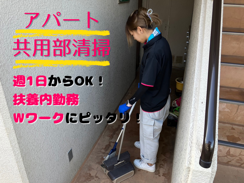 仕事内容 \扶養内・副業希望の方にピッタリ!/ ★――――――――――――――――――★ ◇アパート共用部清掃◇ 現場直行直帰、週1日~OKだから スキマ時間で働ける! カンタン作業だから、未経験でも安心 ★――――――――――――――――――★ 家庭やプライベートの隙間時間を活用して、 無理なく働くことができます。 <アパート共用部スペースの清掃> ◆エントランス・通路・階段・駐車場・ 駐輪場などの掃き掃除 ◆手すり・インターホンなどの拭き掃除 ◆ゴミの分別・除草剤の散布 など簡単な軽作業 慣れるまで社員が同行して丁寧に教えます。 初めての方でも安心のスタートが実現♪ 慣れたら自分のペースで作業可能です! ★――――――――――――――――――★ *力仕事はありません *複数現場を周っての作業をお任せします …1日1現場~可 *現在在籍のスタッフが1日に周る件数 …1件~12件程 ★――――――――――――――――――★ 【 現場について 】 ・柏市、流山市、野田市の現場を担当いただきます。 ※日によって現場のエリアの変動有 ・1日の中でエリアをまたぐ長距離移動は ありませんのでご安心ください! ・直行直帰可能なので、効率的に働けます。 【 注目ポイント 】 ✅勤務ペース自由自在! ――――――――――――― …どれだけ稼ぎたいかによって、 勤務日数・勤務時間の調整OK! 「扶養の範囲内で」 「子供が学校へ行っている時間に」 「シッカリ稼ぎたい!」 等、ご相談ください◎ ✅オシャレの自由度高め! ――――――――――――― 髪型・髪色自由、ネイルやピアスOK! 「普段のオシャレを楽しみたい!」 といった方でも安心です♪ 現在も、ネイルやピアス、ヘアカラーが ばっちり決まったスタッフが活躍中です! ✅学歴、性別不問 ――――――――――――― …力仕事はなく、簡単な軽作業です。 現在30代~50代の男女スタッフが活躍中! ✅清掃のプロも目指せます ――――――――――――― …実は奥が深い清掃の世界。 キレイ好きな方にピッタリのお仕事です。 未経験の方も歓迎!丁寧に教えるので、 是非飛び込んでくださいね◎