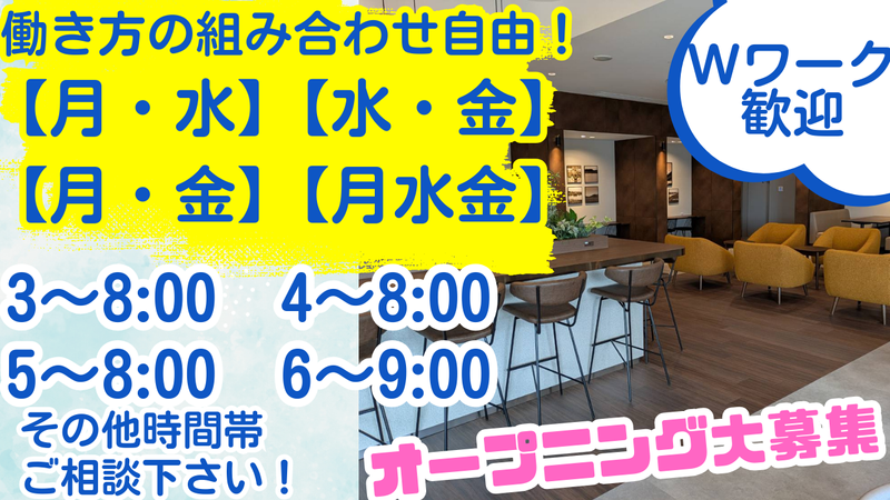 勤務時間詳細 【早朝3~5時間】授業前・本業前にサクッと稼げる! 【募集シフト】3~6時間勤務 ★積極採用中★ 3:00~9:00の時間帯 ━━━━━━━━━━━━━━━━━ 3:00~7:00/8:00/9:00 4:00~7:00/8:00/9:00 5:00~7:00/8:00/9:00 6:00~8:00/9:00 最長13:00まで相談OK! ■その他OK時間帯 5:00~10:00 / 5:00~13:00 7:00~14:00etc ━━━━━━━━━━━━━━━━━ ■勤務曜日(週2~3日) 月水金 / 月水 / 水金 / 月金 ※希望のパターンを選べます ━━━━━━━━━━━━━━━━ <こんなスタッフが活躍中!> 【大学生Aさん】 →月・水・金 5:00~9:00 「1限が9時からなので、 授業前にバイト! 朝から体を動かすと授業中も 眠くならないです。 お昼からはサークルや バイト後の自由時間に♪」 【WワーカーBさん】 →月・水 3:00~7:00 「本業が9時出社なので、 早朝に4時間だけ。 通勤ラッシュ前に終わるから快適! 週2日でも結構な額が貯まります♪」 【フリーターCさん】 →水・金 4:00~9:00 「昼からは趣味やプライベートを 優先したくて。 5時間×週2で効率よく稼げる! 早起きの習慣がついて 体調も良くなりました♪」 【主婦(夫)Dさん】 →月・水・金 5:00~8:00 「家族が起きる前に仕事終了! 子どもを送り出してから 家事もできるし、短時間でも 週3なのでしっかり収入に♪」 【大学生Eさん】 →月・金 6:00~9:00 「週2日だけなので無理なく 続けられます。 朝の3時間で稼いで、 午後はゆっくり。 テスト期間も シフト調整してもらえて 助かってます♪」 ━━━━━━━━━━━━━━━━━ あなたのライフスタイルに合わせた 働き方を一緒に見つけましょう!
