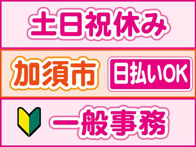 仕事内容 人気の事務員さん募集、即日勤務OK PC基本操作でOK、50代の中高年の方も活躍中 「一般事務スタッフのポイント」 〇PC基本操作ができれば未経験OK 〇日勤のみ、残業なし 〇土日祝休み 〇時給1,300円スタート 〇20代30代40代50代の女性活躍中 〇うれしい制服貸与 〇空調完備 〇日払いOK(規定内) 〇履歴書不要 〇交通費支給(規定内) 〇「マイリク定着支援」導入企業! 【一般事務スタッフの仕事内容】 加須市にある金属を扱う物流倉庫での事務員さん 具体的には ・伝票作成 ・請求書発行 ・データ入力 他、お任せします 難しい知識スキルは不要です PCの基本操作ができれば未経験の方もOK 職場見学OK(30分~1時間程度) 【データ入力の勤務について】 〇土日祝休みの週休2日制 〇日勤のみ、残業なし 8:05~17:00(実働8時間) 急な発熱・体調不良・冠婚葬祭など、 突発的なお休みに柔軟に対応しております。 【こんな経験活かせます!】 下記経験者は前職活かせます。 〇一般事務パート・アルバイト 〇オフィスワーク、デスクワークパート・アルバイト 〇データ入力、伝票処理パート・アルバイト 〇事務系派遣 〇中高年アルバイト 〇主婦(夫)パート 前職不問で採用しております。ブランクOK ご不明な点はお気軽にお問い合わせください お電話でのご応募、ご質問も受付中! 株式会社ロフティー 白岡支店 担当営業、または採用担当まで TEL0800-222-6888(フリーダイヤル) お仕事情報など採用ページはこちら https://entori.jp/lofty-shiraoka コーディネーター・定着支援のWサポート体制導入 「マイリク定着支援」導入企業! アンケートで職場の様子を確認し、 コーディネーター・定着支援担当が連携してサポート。 はじめての派遣でも安心して働けるよう迅速かつ 丁寧にサポート対応いたします。