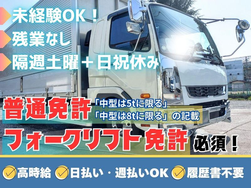 求めている人材 ✱人柄重視で採用!✱ <必須条件> ⏩要普通免許(AT限定可) ※「中型は5tに限る」「中型は8tに限る」 いずれかの記載があるもの 上記の免許ではない場合は、要準中型免許 ⏩フォークリフト免許 <歓迎条件> ⏩配送ドライバーの経験者 <こんな方にピッタリ!> ◎日勤のみのお仕事をお探しの方 ◎自分の時間もしっかり取りたい方 ◎車の運転が好きな方 ・…━━━☆・…━━━☆・…━━━☆ ✅経験者・有資格者歓迎 ✅学歴不問 ✅長期歓迎 ✅フリーター歓迎 ✅ブランクOK ✅男性活躍中 ✅ミドル活躍中 ・…━━━☆・…━━━☆・…━━━☆ ✨こんな経験も活かせます♪ ルートドライバー、ルート配送 配送配達、軽貨物ドライバー、運転手 運転手ドライバー、中型ドライバー 業務委託ドライバー、トラック運転手 3tドライバー、4tドライバー etc...当てはまる方も大歓迎です! ・…━━━☆・…━━━☆・…━━━☆