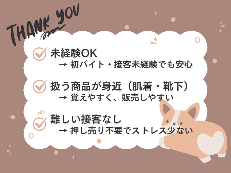 仕事内容 毎日使う肌着・下着・靴下など、身近な商品 を扱うショップです♪ 日常アイテムなので覚えやすく未経験の方も 始めやすいお仕事です! ▶応募:履歴書不要・即日対応OK ▶ブランド:GUNZE(グンゼ) ▶勤務先:南大沢アウトレット ▶通勤:駅チカ徒歩3分 ✅仕事内容 ・接客、販売(難しい提案はなし) ・レジ対応 ・商品陳列 ・在庫管理 ・バックヤード整理 ※商品知識や接客は研修でしっかりサポートします \働きやすさ重視の方にピッタリ/ □未経験OK!研修ありで安心スタート □服装・ネイル・アクセ自由♪おしゃれOK □ノルマなし!プレッシャーなし □社割40%OFFでお得に購入可能 □週2日〜OK・短時間OK □シフト柔軟 □フルタイム/扶養内どちらも歓迎 □学生・主婦(夫)・フリーター活躍中 □職場見学OKで安心スタート