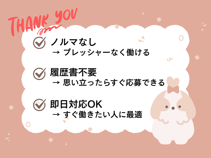 選考プロセス 【スピード採用!即日勤務もOK】 応募~勤務開始までとてもスムーズ♪ ▼選考の流れ 1.担当より携帯電話または、メールでご連絡 2.気軽に話せる面談(WEB面談も可) 3.お仕事スタート! 応募後は専任スタッフがしっかりサポート! 不安なことも気軽に相談できます。 まずはお気軽にご応募ください◎