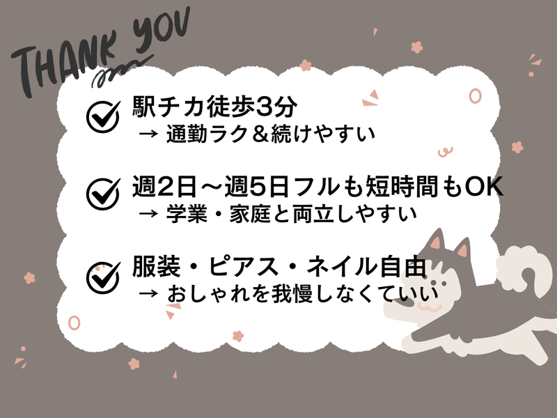 勤務時間詳細 9:30~20:30の間でシフト制 ■フルタイム(実働7.5h/休憩1.5h) 早番:9:30~18:30 遅番:11:30~20:30 ※土日のみ勤務もOK ■扶養内・短時間勤務 1日4時間~ 週2日~ ※時間例:午前:9:30~13:30/放課後:17:00~20:30 ※勤務時間や日数は相談可能です
