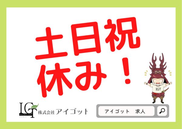 休日休暇 休日 土日 *完全土日休み!GW・夏季休暇・冬季休暇もある為プライベートも充実出来ます。 ■年間休日120日以上 ■土日休み ■完全週休2日制 ■有給休暇 ■夏季休暇 ■年末年始休暇 ■GW休暇(ゴールデンウィーク) ■慶弔休暇