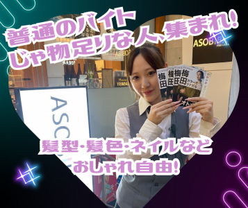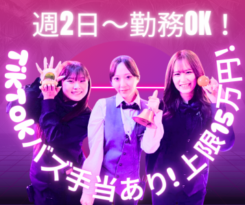 求めている人材 【歓迎】 ・オープニングで働きたい方大歓迎! ・未経験者さん大歓迎!(初めてのバイトチャレンジも大応援!) ・これまでに接客や飲食店、サービス業界経験者さん、音楽フェスなどのイベントスタッフさん! …etc.エンタメ業界での勤務経験者の方も大歓迎! 【既存店舗ではこんなみなさんが活躍中!】 ・モデル、俳優、DJ、芸人の卵が活躍中! ・20代、30代の楽しい男女が多数活躍中! ・学生・フリーターさんたちが時間を有効活用しながら活躍中! ・掛け持ち・Wワーク・副業で稼ぐ仲間が活躍中! ・とにかくイベント大好き! ・盛り上げるのが大好きで自称、盛り上げ隊長の方! ・人とお話をするのが大好きな方! ・アソビバーをチェックしていた!いや、いったことが有る!または、とても興味がある方! ・楽しいことをしながら働きたい方! ・周りのみんなを楽しませるのが得意な方! ・ゲームやカラオケなど、遊ぶことが大好きな方! 【未経験からでも安心なシステムって?】 みんな初めは、未経験!そんなみなさんでも安心して、 お仕事ができるように社内研修をご用意しています。 仕事の「これってどうするの?」や「自己成長なども」なので、学生の方には就活で活かせるノウハウも! 一人ひとりのみなさんがチーム力やコミュニケーション力を身に着けて頂けるようにバックアップ! ・みんなが、楽しく成長できるプログラムでお迎えします! (分からないことや個人的なお悩みなどでも真剣に対応しますので、ご安心ください!) 【実は…】 お酒を飲まない!スタッフなんです。 (スタッフのみなさんは、飲酒はできません!ゴメンナサイ!でもソフトドリンクはOKで~す♪)