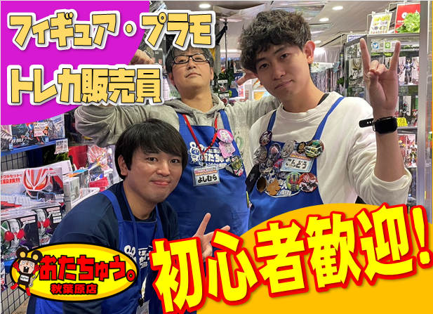 仕事内容 <おもちゃ・フィギュア好き集まれ!> ◆交通費支給で働いた分稼げる◎ ◆髪色・髪型自由!前後の予定も入れやすい◎ ◆社員登用あり!「せっかく働くなら好きなことを仕事にしたい」そんな方お待ちしています! <募集内容> 秋葉原に5店舗を構えるおたちゅう。 1号店のスタッフを募集します! お客様への接客や販売、中古品の買取、 レジ業務などをお任せします。 先輩スタッフが商品の値段査定の お手本を見せてくれるので、 未経験の方でも安心して働くことができます◎ 1日あたり8名程度のスタッフでシフトを組んでいるため、 困ったときもすぐに相談できる体制です! 笑顔で丁寧な対応ができれば、大丈夫◎ まずは、お客様に明るく「いらっしゃいませ」からスタートしましょう! <店舗紹介> ・1号店: コミックのフィギュア・トイや 美少女フィギュアなどの根強いファンが多数来店! 「子どものころ憧れていたあのヒーローのアイテム」 「やりこんでいたゲームの推しキャラフィギュア」 「ずっと連載を追っているマンガの激レアグッズ」 …などなど、さまざまなホビーに出会える職場です★ 好きなジャンルがあれば、そのジャンルのコーナーの売り場づくりをこだわったり… 趣味や「好き」という想いがある方にとってはたまらないバイト先です(笑) ・3号店:特撮フィギュア・TOYグッズ専門店 ・5号店:トレカ専門店 上記店舗も同時募集中!!