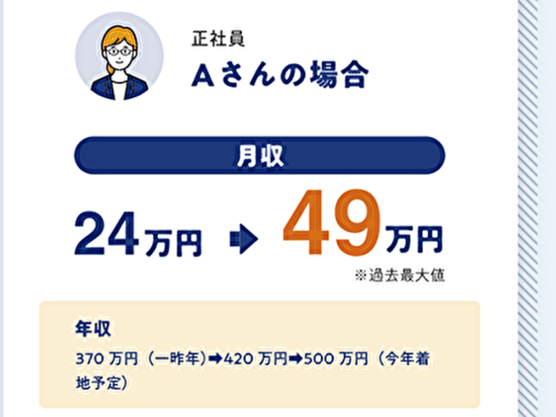 月給200,000円~400,000円 給与詳細 基本給:月給 20万円 〜 40万円 固定残業代:なし 【一律手当】 全員に一律で支払われる通勤・皆勤・家族手当金額:なし 全員に一律で支払われるその他手当金額:なし 成果報酬がございます。 【給与例】 給与例 正社員 年収 370万円(一昨年)→420万円→500万円 非常勤社員 年収 194万円(一昨年)→223万円→113万円(今年7ヶ月)