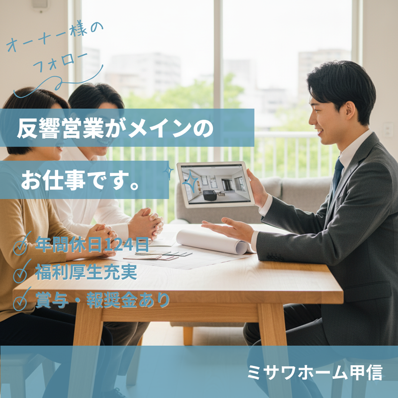 仕事内容 ※こちらは未経験者向けの求人です※ ┏━━━━┓ ◆ 応募条件 ◆ ┗━━━━┛ ・35歳未満の方(長期キャリア形成のため、例外事由3号のイ) ・専門知識不要・経験不問! ┏━━━━━━━━━━━┓ ◆ ミサワホームで働く魅力 ◆ ┗━━━━━━━━━━━┛ ・資格を取得し手に職をつけられる! ・圧倒的な顧客基盤!無理なノルマなし ・フレックスタイム制で柔軟な働き方 ・頑張りは報奨金やボーナスで還元! ┏━━━━━┓ ◆ 仕事内容 ◆ ┗━━━━━┛ お客様が困っていることや 理想のお住まいのイメージを伺いながら、 自由な発想でリフォームプランを 企画提案していく仕事です。 自分のアイデアを存分に発揮できます。 手掛ける物件はミサワホームや 一般在来住宅のほか、マンション、 宿泊施設、児童福祉施設、店舗、 オフィス、工場まで様々。 何年やっても新しいワクワクと 出会える仕事です! ┏━━━━━━━━━━━┓ ◆ 導入研修ももちろん完備 ◆ ┗━━━━━━━━━━━┛ ミサワホームグループの導入研修で 業務についてしっかりマスターして いただけます。 その後、配属部署でのOJTがあるので 分からないことは、何でも遠慮なく 上司や先輩に聞ける環境です。 あなたが一人前になるまで、 仲間がしっかりフォローします! ぜひ安心してご応募ください! ┏━━━━━━━━━━┓ ◆ 具体的なお仕事の流れ ◆ ┗━━━━━━━━━━┛ (1) ヒアリング お客様が困っていること、 理想のお住まいのイメージ等、 具体的にイメージを共有できるまで 細やかにお話を伺います。 (2)プラン作り・ご提案 デザインやプランを企画し、 お見積りをご提示。 簡単なデザインのパース画や 設計図面作り、インテリア コーディネートも伝授します! ものづくりが好きな方にも 楽しんでいただける工程です。 社内には設計担当や工事担当も いますので、すぐに相談できる 体制が整っています。 (3) 資材手配 資材メーカーに連絡し 必要な資材を手配します。 (4) 工事の管理 工事期間中は現場を確認し、 職人さんへの指示や お客様への状況報告を行います。 (5) アフターフォロー 工事完了後も長くお客様との お付き合いは続きます。 リピートオーダーにつなげていきます。 ┏━━━━━━━━━━━━━━┓ ◆ ミサワホームの""ここ""がすごい ◆ ┗━━━━━━━━━━━━━━┛ 圧倒的な顧客基盤をベースに \インセンティブで還元!/ 頑張った分は正当に評価し、 報奨金やボーナスに反映されます。 とはいえノルマに追われるような 営業でもありません。 創業50年を超えるミサワホーム。 長年築いた圧倒的な数のオーナー様 という顧客基盤をベースに 提案をしていけるのが魅力です! じっくり信頼関係を築きながら、 心から喜んでいただける提案をして、 成果を出していきたい方にぴったりです。 ワークライフバランスを \大切にした働き方を実現/ ・全国転勤なし!地域密着 ・働く時間も調整可!フレックス制 ・男女ともに育休の取得も奨励 多くの社員が助け合いながら、 家庭やプライベートと両立し 営業としても高い実績を残しています!