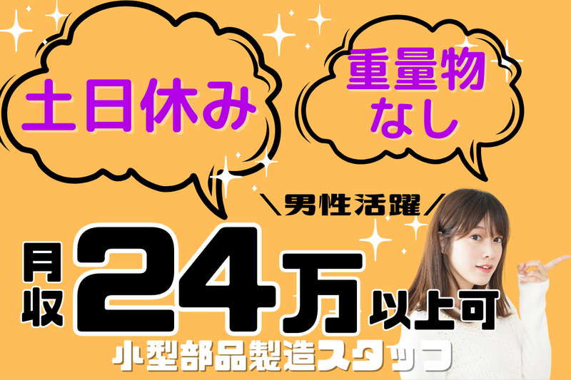 仕事内容 【 応募から2週間程度で内定可能! 】 《 ここがポイント! 》 ●月収24万円以上可能 ●土日休みでプライベート充実 ●家具家電付きの寮完備 ●髪型自由♪ ●扱うのは小型の部品です ●重くないモノづくりの現場 《 アクセサリー・小物部品製造 》 アクセサリーなどに使われる 小さなパーツを製造する工場! ▼お願いする作業内容は... ・マシンオペレーター ・顕微鏡での検査 ・作業台での組付け など! 十分な作業スペースがあるので コツコツ、淡々と作業を進られます。 - 《 空調完備で快適作業 》 作業環境は快適、空調完備! 夏でも冬でも作業がしやすい! - 《 土日休み! 》 「週5勤務は疲れるな」 という方にオススメ!! 4勤2休だから4日頑張れば 2連休が待ってます☆ お休みの計画も組みやすい◎ - 《 ワークライフバランス重視派へ 》 お待たせしました。 ワークライフバランス重視派のあなたへ! 土日休みのお仕事です。 平日に勤務して、週末は思いっきり 羽を伸ばせる! ◎金曜は仕事を終わらせて夜更かし ◎土曜は趣味に全振り ◎日曜はゆっくり過ごす こんな1週間生活に転職しませんか? - 《 通勤もラクラク♪ 》 流通センターでのお仕事! 通勤もしやすい立地です。 交通費支給もあり(規定あり)!
