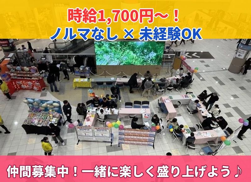 仕事内容 家電量販店や大型商業施設で開催される携帯販売イベントで、 お客様をイベントスペースに呼び込むお仕事です! ✨スマホの知識?販売経験?一切いりません! やることはシンプル、「笑顔でお客様に声をかけること」だけ! たとえば…… ・お子さまに風船を配ってプレゼント ・「少しだけ見て行きませんか?」と笑顔でご案内 ・家族連れに「ガラポン抽選やってますよー!」と楽しくお声がけ ・スタッフTシャツを着てイベント感を演出! 興味を持ってくれたお客様は、社員スタッフにバトンタッチするだけ! 「売る」プレッシャーはゼロです。 ━━━━━━━━━━━━━━━━━━ ◎ 職場の雰囲気 ━━━━━━━━━━━━━━━━━━ 同世代の学生スタッフが多く、初日からワイワイ楽しめる現場です! 1現場あたり約10名で動いていて、そのうち社員・先輩スタッフが3名常駐。 困ったことがあればすぐ相談できるので、ひとりで悩む心配はありません。 「声かけって緊張する…」「うまく話せるかな」 そんな不安も、先輩が隣でしっかりフォローします! ━━━━━━━━━━━━━━━━━━ ◎ 安心ポイント ━━━━━━━━━━━━━━━━━━ ノルマは一切なし! 丁寧な研修あり! 先輩スタッフが現場でしっかりサポート! はじめてのバイトでも安心してスタートできます♪ ━━━━━━━━━━━━━━━━━━ ◎ こんな人、大歓迎! ━━━━━━━━━━━━━━━━━━ ・にぎやかな場所が好きな人 ・人と話すのが好き・得意な人 ・お祭りやイベントの雰囲気が好きな人 ・バイト初心者・接客未経験の人 ・週末だけガッツリ稼ぎたい学生さん ━━━━━━━━━━━━━━━━━━ ◎ こんな方におすすめ ━━━━━━━━━━━━━━━━━━ 未経験OK!バイト初めての方もどうぞ! 週末だけで時給1,700円〜、しかもワイワイ楽しい現場。 「楽しく稼ぎたい!」そんなあなたにぴったりです♪ まずは気軽に応募してみてください!