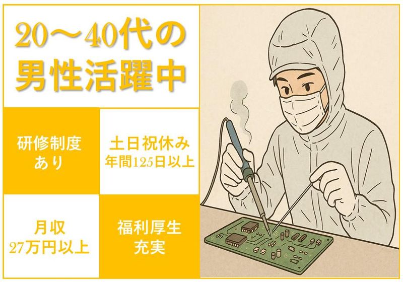 仕事内容 ▼▼▼▼▼▼▼▼▼▼▼▼▼▼▼▼ \20代~40代男性活躍中! 日勤だけの高時給のお仕事です/ ▲▲▲▲▲▲▲▲▲▲▲▲▲▲▲▲ お仕事スタートは1月下旬・2月上旬と順次開始予定です。 転職をお考えの方、今のうちに次の仕事を決めませんか! ✨【安定の高時給1,800円+交通費支給】 月収例は32万円以上(残業代込み)も可能! 安定した日勤だけのお仕事になりまます。 土日祝日もお休みで、年間休日127日確保しています。 プラーベートも「趣味」に「勉強」に十分時間を割く事も出来ます。 さらに交通費は全額支給なので、遠方からの通勤でも負担ゼロ。 もちろん車通勤・バイク通勤も可能です。 しっかり稼いでプライベートも充実させましょう! ________________________________________ 【仕事内容】人工衛星の翼部分のパネルを作っています ✅パネルの製造:パネル原料を機械にセットして、機械で硬化を行います。 硬化したパネルをカッターなどでカットする作業 ✅パネルへの配線、接着作業:パネルに配線を図面通りに接着剤で貼付け、はみ出た部分を拭きとりします。 通電部分にははんだで部品を取り付けたりする作業も行います。 ✅クリーンルーム内なので空調完備、明るく清潔な職場です。 クリーンルームは1年中21℃設定、夏も涼しく作業できる環境になります。 ※過去に工場での作業経験者の方、例えば「はんだ付け」「基板製造」「配線作業」 などの経験がこのお仕事で活かせます。 ________________________________________ ✨【未経験から正社員へ!資格取得も支援】 まずは派遣社員としてスタートし、業務に慣れた後は当社の正社員登用制度があります。 年齢や経験を問わず、やる気と実績次第でステップアップ可能。 さらに、フォークリフト・クレーン免許などの資格取得支援制度も整っており、将来に向けて着実にスキルアップが図れます。 ________________________________________ ✨【大手メーカーで充実の研修制度あり】 配属先は、業界トップクラスの大手メーカー工場。 製造未経験の方でも、座学+現場OJTで丁寧に指導してもらえる体制があり、工具の使い方や製品知識も一から学べます。 分からないことはすぐに聞ける環境なので、モノづくりが初めての方も安心してスタートできます。 自分の作った製品が宇宙へと夢のある仕事です。 ________________________________________ ✨【20~40代の仲間が活躍中!職場の雰囲気◎】 同じように未経験からスタートした20代~40代のスタッフが多数在籍中。 年齢が近いので話しやすく、仕事終わりに食事に行ったり、休憩中に情報交換をしたりと、自然と馴染める職場です。 1人で黙々というより、チームで協力して進める職場なので「人間関係が不安…」という方も安心です。 ________________________________________ ✨【安心の管理体制】 当社担当者が通勤時、お昼休憩時、退勤時など週に2回3回と訪問しています。 職場での困りごと、仕事上での不安など話しやすい環境づくりを徹底しています。 なにかあればすぐお声がけください。