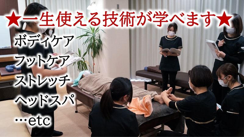 求める人材: 【学歴】 高卒以上 【未経験歓迎】 セラピストとして自信をもって仕事ができるように、6ヶ月間の育成期間を設けています。 「未経験でもついていけるかな?」「覚えるのが苦手…」といった不安をお持ちの方でも大丈夫です。 入社後2ヵ月間は提携先の日本セラピスト整体学院にて、授業形式で3つ施術技術「二重の極み2段押し」「一撃押し」「無反動の離れ」をもとにしたボディケア、フットケアなどの施術技術と、カウンセリング、受付対応などの接客をロープレを交えながら学びます。 研修は、日本セラピスト整体学院の教育内容をもとに基礎からていねいに学べます。 通常は高額な専門教育内容ですが、入社後の研修として費用負担なく受講できます。 2ヵ月間の研修終了後は、セラピストとしてデビューします。 デビュー後も、育成期間中は面談、施術技術チェックや接客チェックを行い、実際に働いていく中で出てくる疑問や不安をなくしていきます。 育成期間終了後も、施術と接客スキルがアップできる仕組みが整っています。 一般社団法人日本リラクゼーション業協会のリラクゼーションセラピスト2級試験にもチャレンジしていただきます。 合格率は95%以上です。わからないところは、ていねいに教えます。 早い人では、育成期間中から指名のお客様がつきます。 教育体制が充実しているので、未経験からでもお客様に喜んでいただく施術ができるようになります。 自分の施術でお客様が感動してくださり、リピートしてくださったりすることで、やりがいをもって働けるようになります。