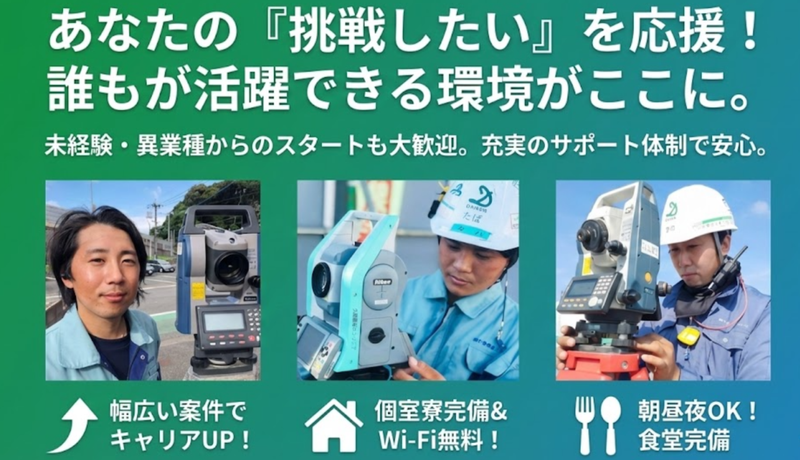 求めている人材 ✅普通自動車運転免許(AT限定可) ✅測量等の経験や関連資格がある方 ✅学歴不問 ✅転職回数不問 ✅外国出身の従業員も在籍
