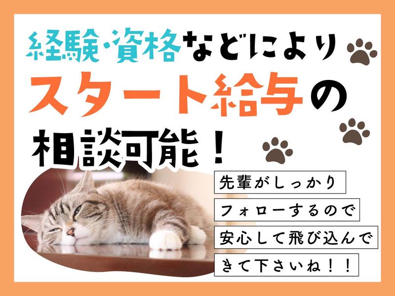 求めている人材 動物を飼ったことがなくても 動物が好きな方、 これから学びたい方なら大歓迎☆ 勤務開始後に教えるので知識は不問! 未経験の方もお気軽にご応募下さいね。 接客や販売の経験がある方、 人とお話しするのが好きな方も大歓迎! 現在20代・30代のスタッフ、 フリーターさん、 主婦さんが多数活躍しています。